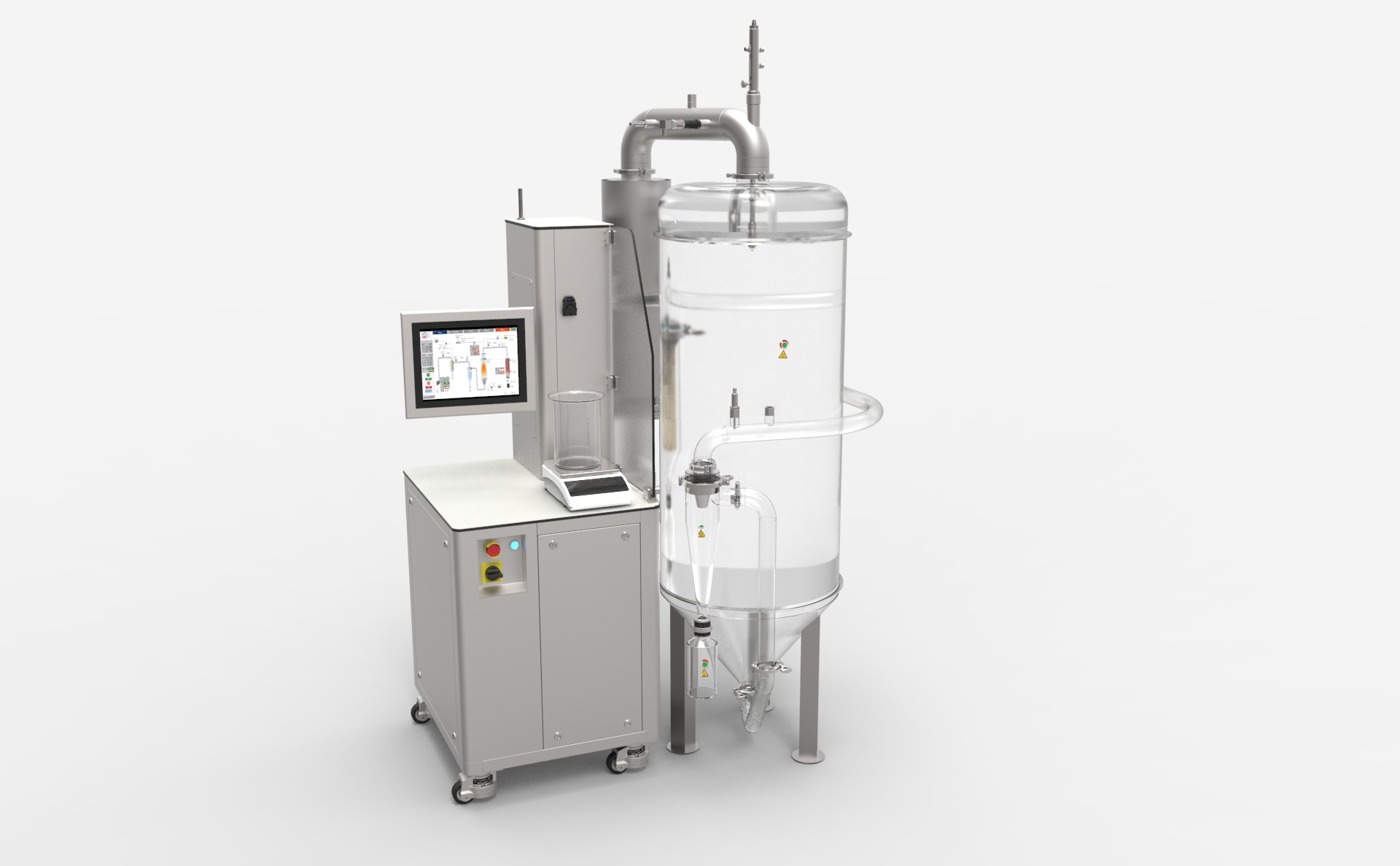 APT 5.0+ Spray Dryer – Nutra/Pharma Line is equipped with a precise humidity monitoring system embedded in the software.  All the parameters are controlled and monitored from the touchscreen HMI assembled on board next to the spray tower. This feature enables end users to record in real time the drying performances and develop DoE models seamlessly.